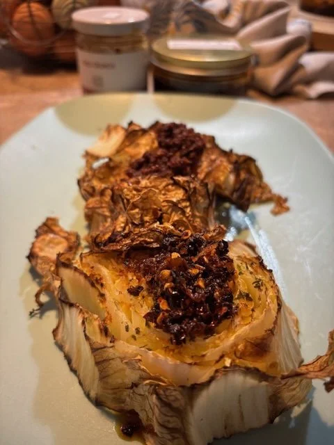 Chili crunch is the artisanal version with tweaks made to the traditional crisp recipe to reflect modern westernized Asian cuisine. Both are a base of chili flakes and oil imparting either tradition or nouvelle. Since I have both in my pantry, no choice needs to be made including how to use it. That roasted cabbage really hit the spot and as always, all the ingredients are available at Central Farm Market.